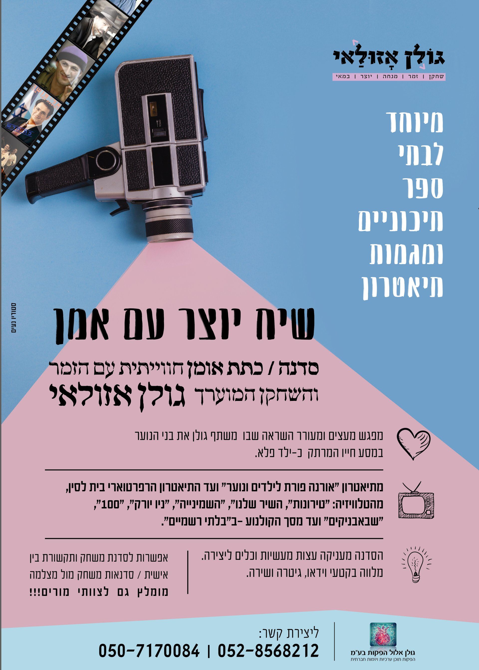 כיתת אומן! גולן אזולאי שחקן המוכר לנו מסדרות הטלויזיה טירונות , בנות בראון , השיר שלנו , שבבניקים , ניו יורק , אחת אפס אפס , שמינייה , הבלתי רשמיים ועוד כהנה וכהנה במפגש מעצים ומעורר השראה על דרכו המיוחדת בעולם הטלויזיה התיאטרון המוזיקה והרוח. כלים ועצות מעשיות – איך יוצאים מהתקיעות אל הפעולה והגשמת הייעוד שלי!
